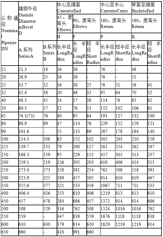 (1)对焊弯头按它的曲率半径来分,可分为长半径对焊弯头和短半径对焊弯头。长半径对焊弯头的曲率半径等于1.5倍的管子外径,即R=1.5D。短半径对焊弯头的曲率半径等于管子外径,即R=1D。式中的D为对焊弯头直径,R为曲率半径。